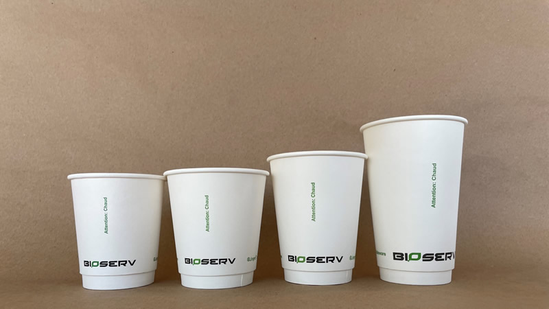 Bioserv Logo on the base of the cup, with 'caution: contents hot' in English and French on the side of the cup.